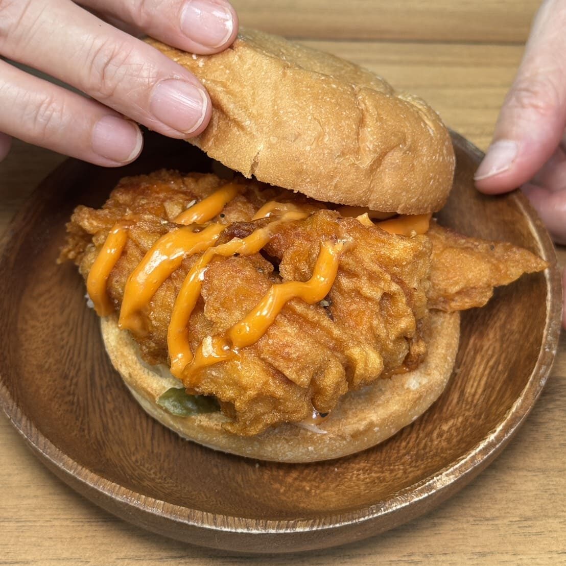 ▼這款雞柳漢堡完全超出我的期待!外層的雞柳條炸得金黃酥脆,一口咬下去喀滋酥脆~裡面依然保留著軟嫩多汁的肉質。雞柳本身有先醃漬過,帶著淡淡的甜味和香氣,單吃就很好吃。