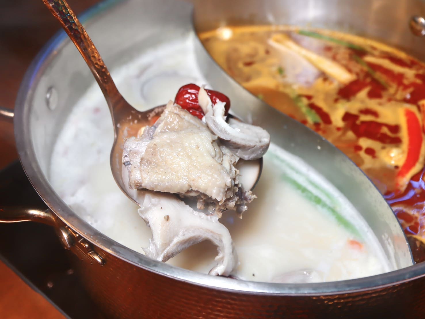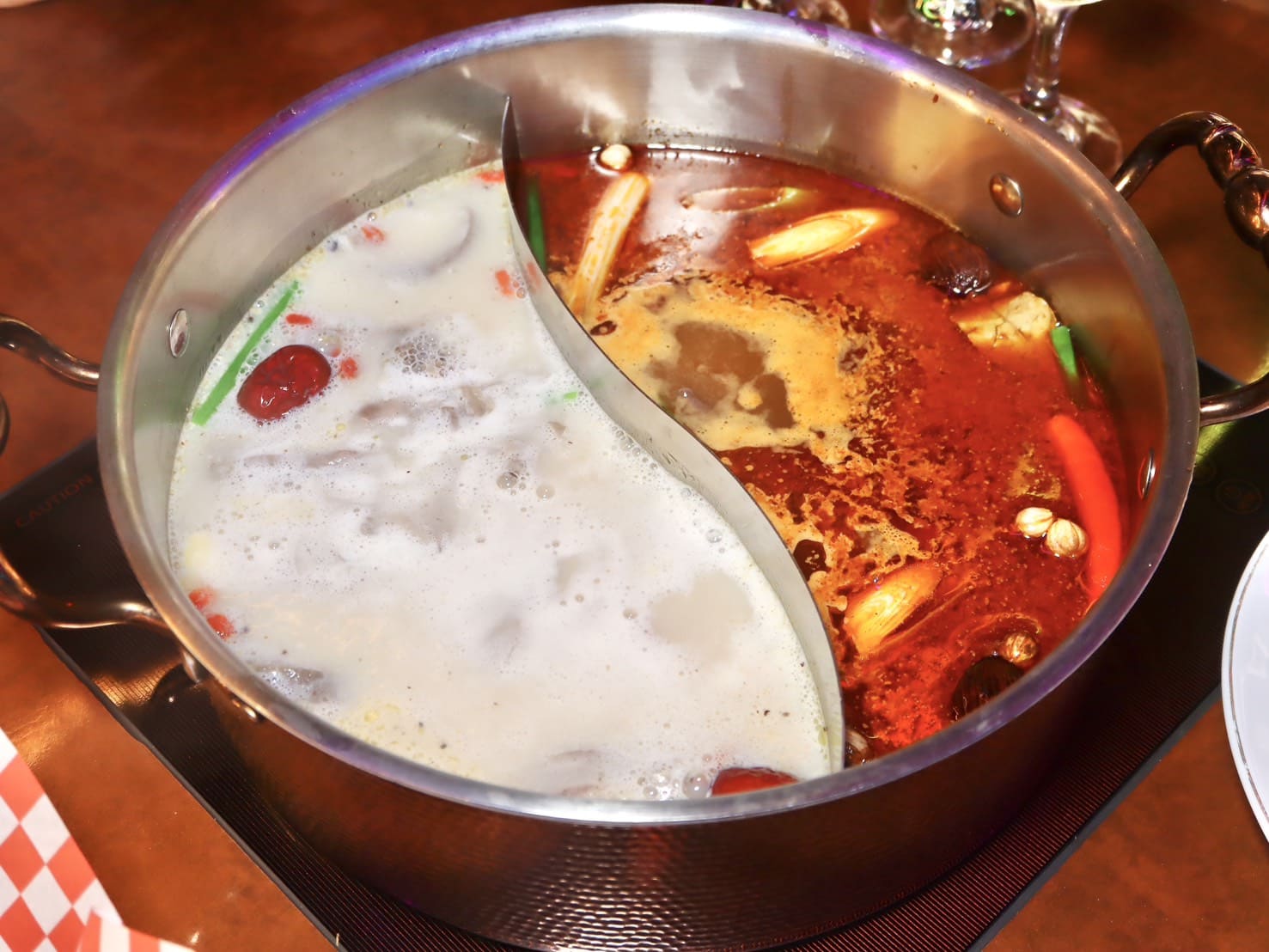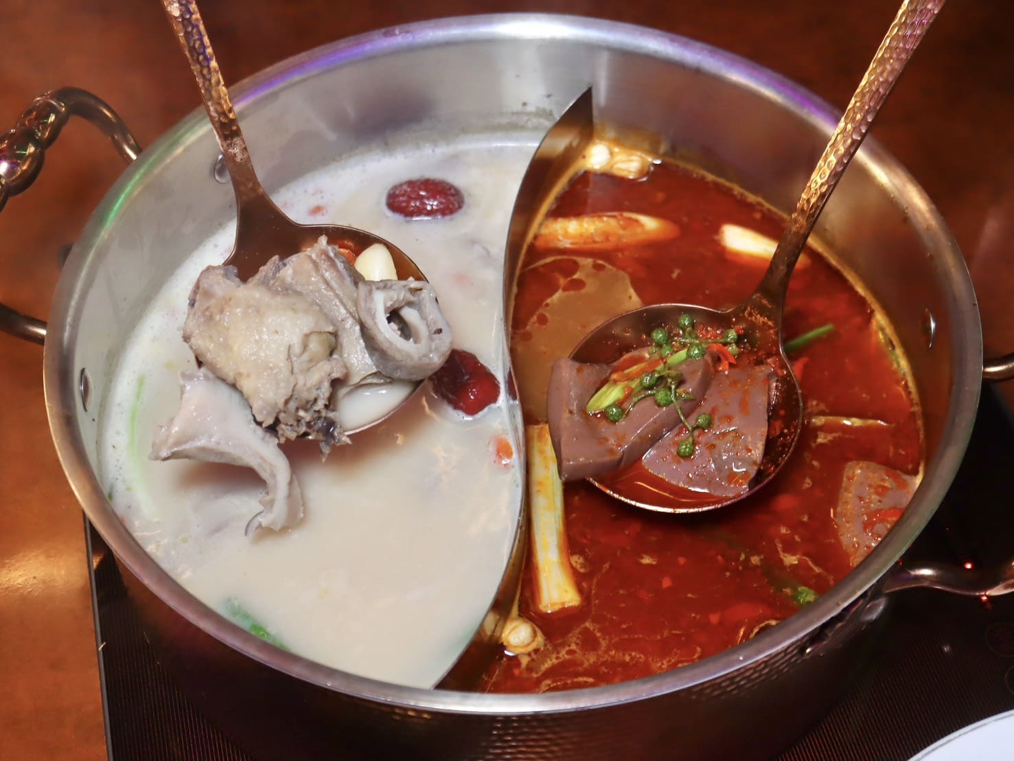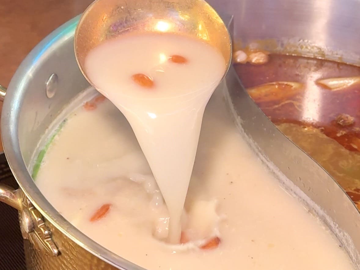 ▼鍋底可以五選二,我們選了招牌「九葉青花椒麻辣鍋」、「貢布胡椒豬肚雞鍋」,兩款鍋底本身就有豐富底料