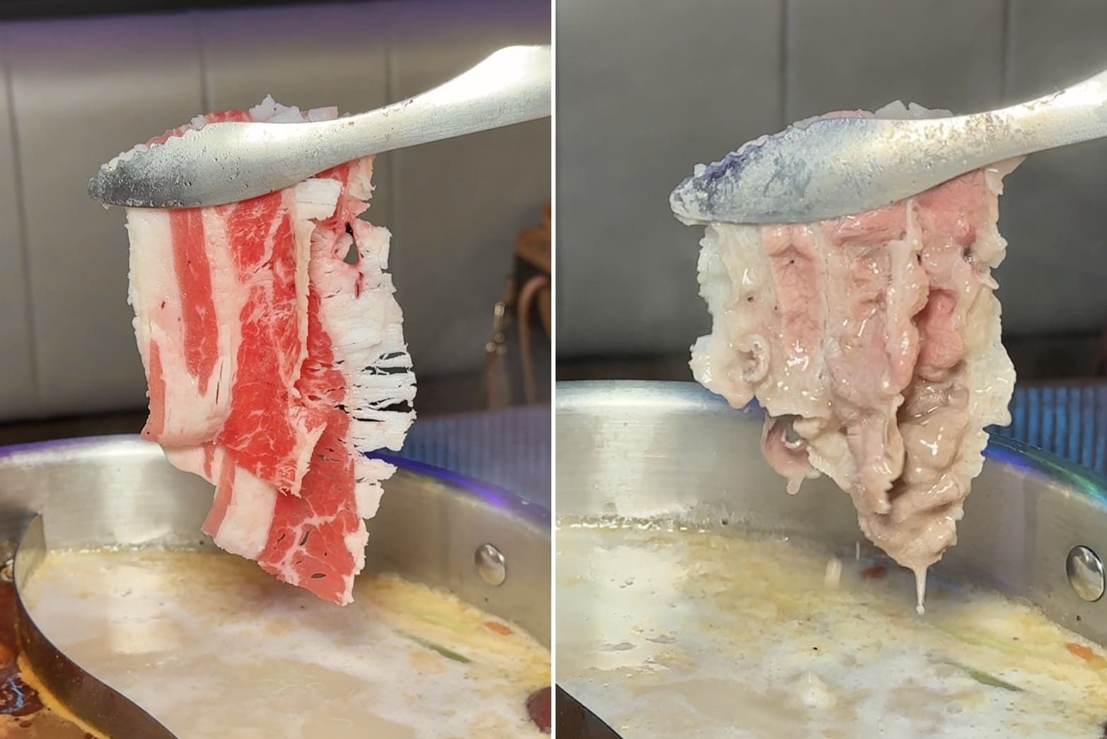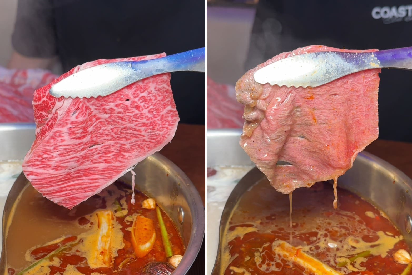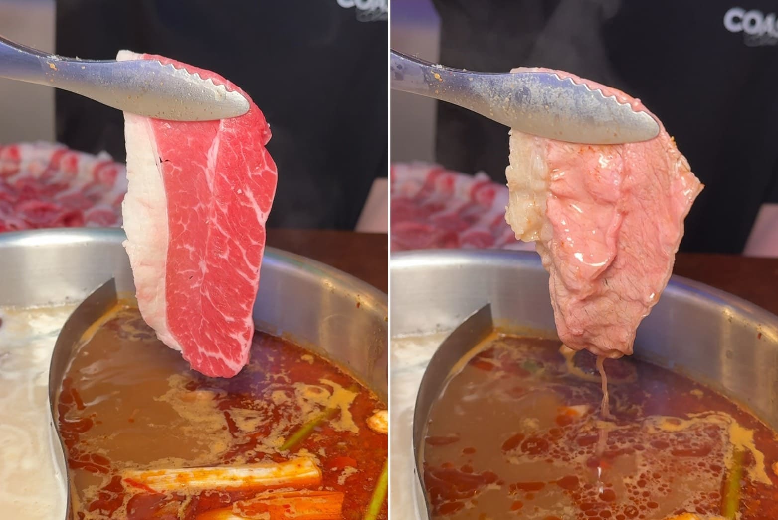 ▼美國特級牛胸腹,油花比例剛好,涮完吃起來香氣十足又帶點嚼勁。那股牛香與九葉青花椒麻辣湯底疊在一起,非常過癮