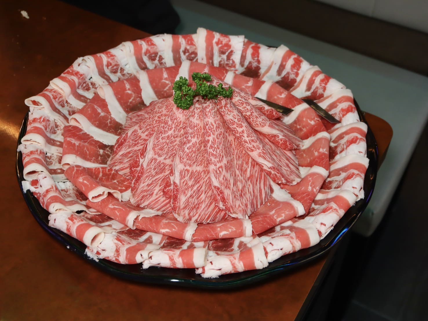 ▼雙人套餐的大肉盤肉量真的多到讓人歎為觀止!一上桌立刻跟朋友傻眼互看XD 尺寸根本是「豪華級山景肉盤」,鋪滿滿三層完全看不到盤底,肉控看到直接眼睛發光。裡頭包含了三種肉品:澳洲冠軍M8-9和牛、美國特級牛胸腹、美國Prime冷藏嫩肩雪花