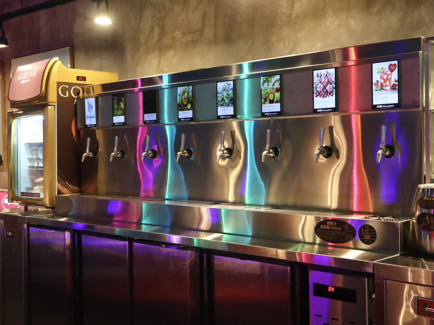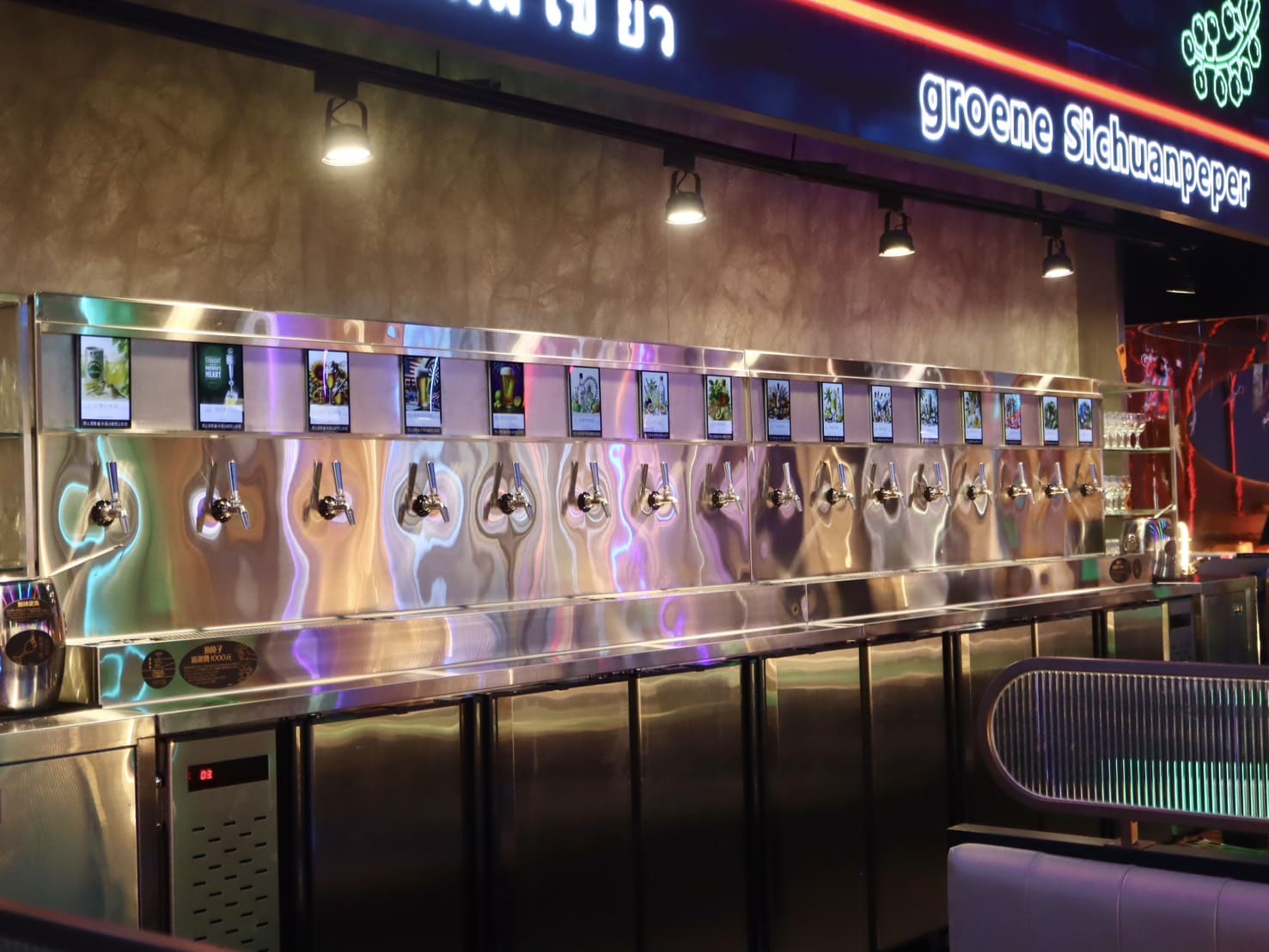 ▼一走進來第一眼就能感受到它和一般火鍋店完全不同的氛圍,店內燈光帶點夜店感,柔和卻又帶著光影層次,搭配大型 LED 潮酒牆,整個空間瞬間有了年輕活潑的氣息。一旁甚至設有拉霸飲料裝置,不論是調酒還是無酒精飲品,都能自己操作,吃鍋的過程也增添了不少趣味。