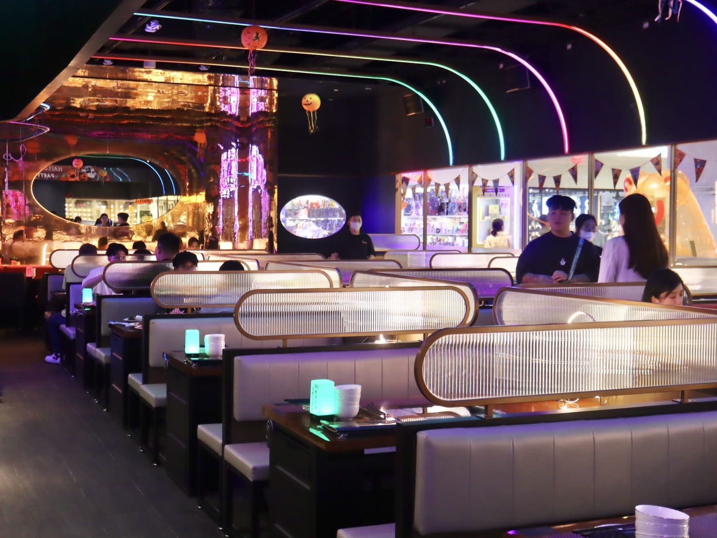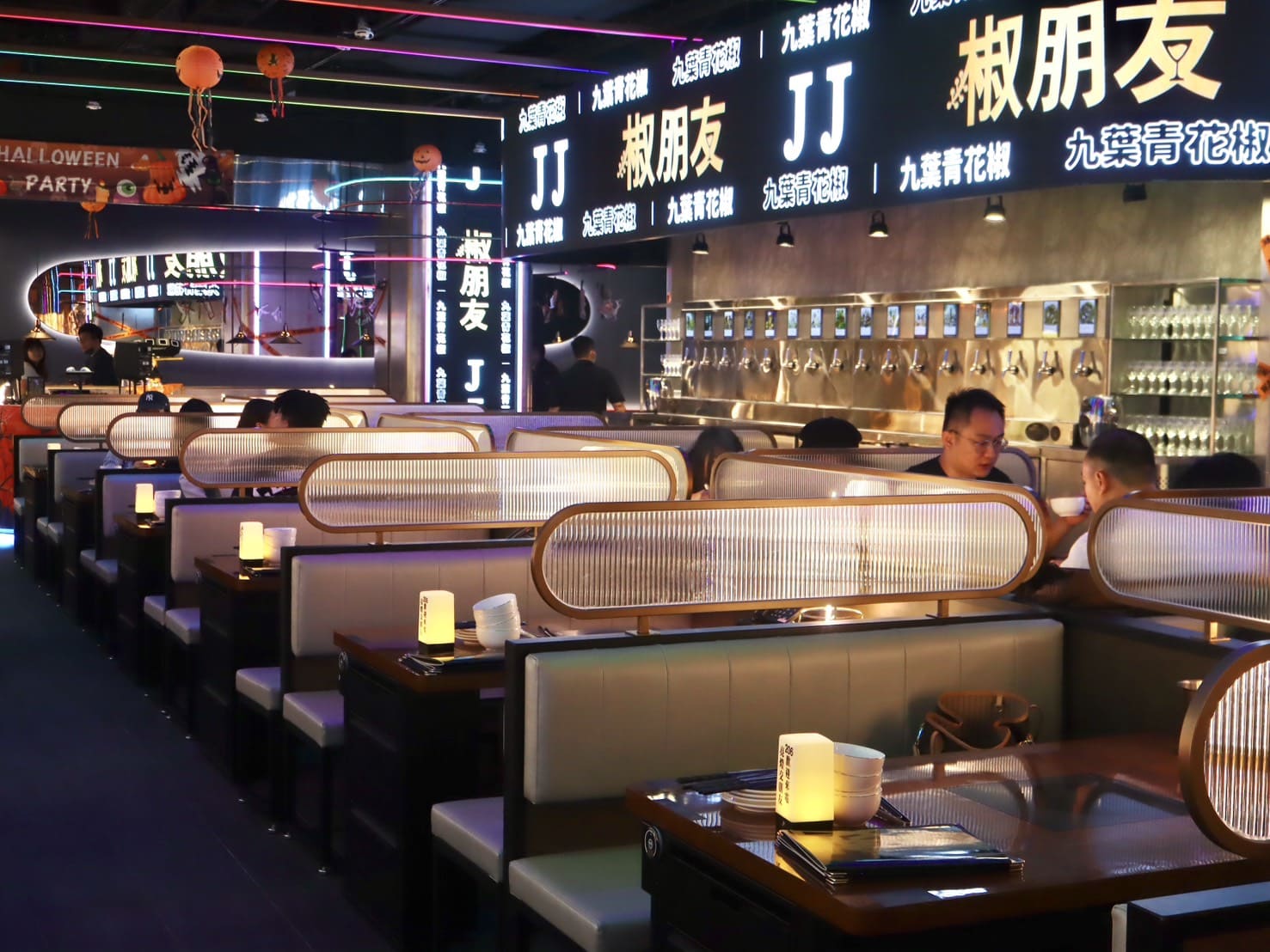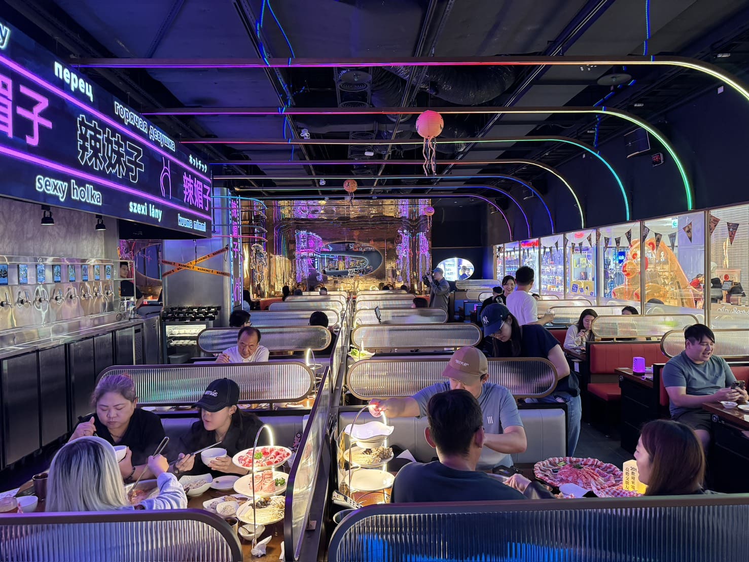 ▼每張桌子都保有足夠距離,相當寬敞舒適。整體氛圍非常適合跟朋友聚會、下班小酌或者慶祝特殊日子,燈光、音樂、鍋物,甚至小細節的互動設計都讓人不自覺地放鬆,想拍照。即使是情侶約會或小型派對,也能找到自己喜歡的位置,一邊享受火鍋的熱度,一邊感受店內充滿活力的潮流氛圍。