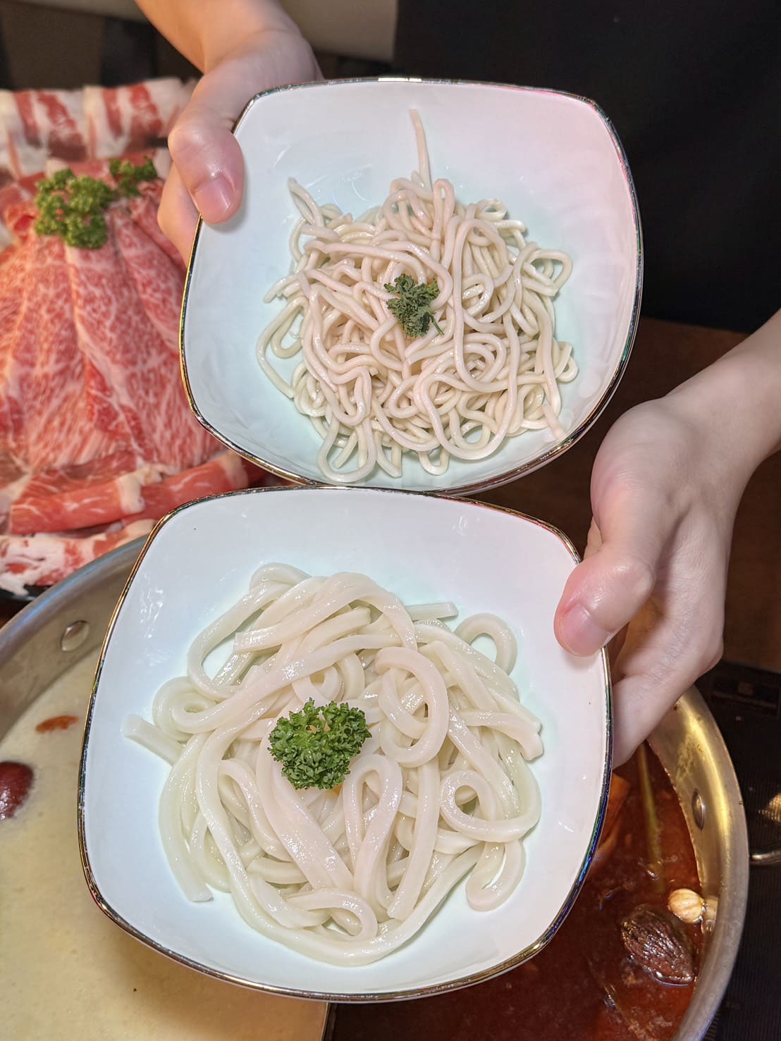 ▼可以四選二,我選了日式拉麵、讚岐烏龍麵。日式拉麵吸湯力超強,放進麻辣湯裡煮個幾十秒就能吸飽湯底的香氣,吃起來鹹香濃郁又帶一點花椒的麻香。讚岐烏龍麵Q彈有嚼勁,煮完依然保有彈性滑順咕溜,這兩款我都覺得很不錯!