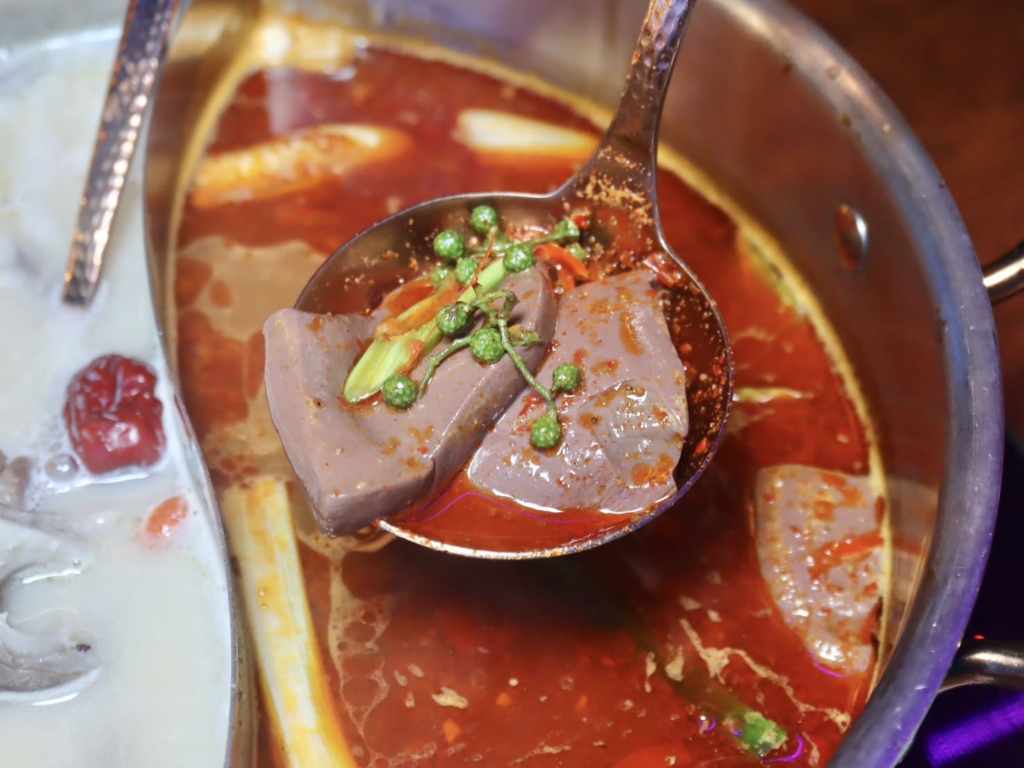 ▼一上桌就超有氣勢,湯色紅亮透澈香氣撲鼻,光聞就知道不簡單。選用重慶江津九葉青花椒,麻香層次感非常豐富,帶著果香入口後麻而不烈,尾韻微微甘香。搭配四川大紅袍花椒與二荊條辣椒。湯底以牛肉高湯慢熬,味道濃郁卻不油膩。鍋裡的經典組合「鴨血和豆腐」 ,鴨血滑嫩入味,豆腐吸滿湯汁後超Juicy。麻香、辣度、鮮味、香氣交錯,層次豐富。辣度層層堆疊,越喝越涮嘴。
